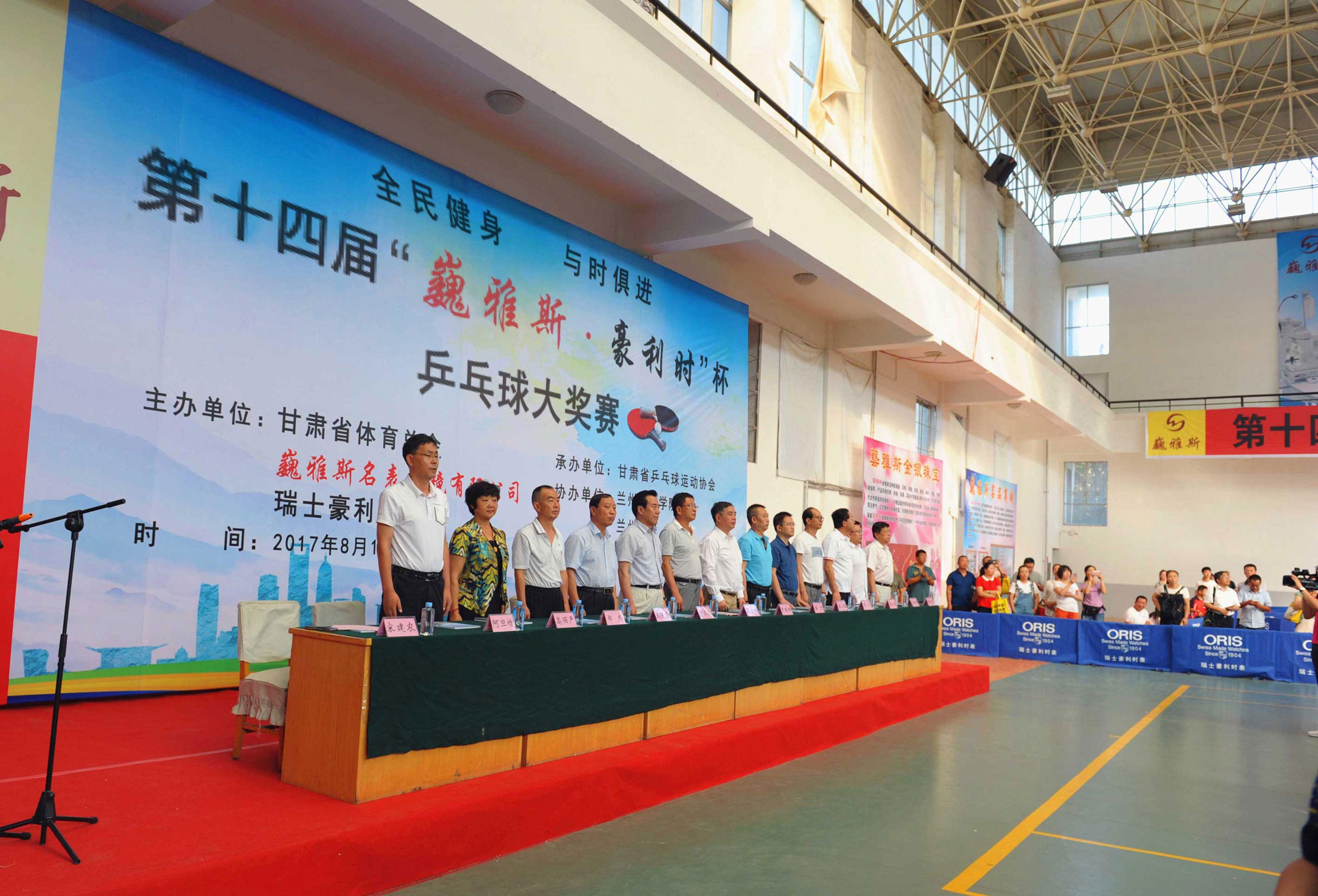 中國(guó)商業(yè)聯(lián)合會(huì)鐘表商分會(huì)副會(huì)長(zhǎng)、甘肅省眼鏡協(xié)會(huì)會(huì)長(zhǎng)、甘肅省乒乓球協(xié)會(huì)副會(huì)長(zhǎng)、巍雅斯名表眼鏡有限公司董事長(zhǎng)裴正江,瑞士豪利時(shí)表中國(guó)區(qū)總經(jīng)理嚴(yán)明輝先生及有關(guān)領(lǐng)導(dǎo)、運(yùn)動(dòng)員、裁判員、教練員、工作人員一千兩百多人參加了簡(jiǎn)樸但氣氛熱烈的大獎(jiǎng)賽開(kāi)幕式。